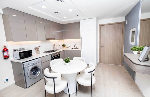 As soon as you step foot in this brand-new apartment, you're welcomed by a very stylish yet highly comfortable living area. It is designed and decorated in a contemporary manner that complements the luxury elements of Dubai!