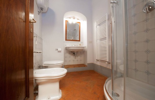 The apartment is located on the first floor (no elevator) and is both comfortable and well-furnished with Italian antiques. It has a large sitting room with satellite television and original stone fireplace, comfortable seating area with armchairs and a sofa bed (120 cm wide) and a dining area.