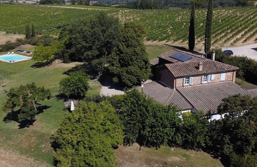 Outside, there is a small pergola covered with Fragola grapevines, featuring a private table and barbecue. The apartment has direct access to the garden and is about 50 metres from the swimming pool. It is situated within the farmhouse, surrounded by vineyards and fields belonging to the estate.