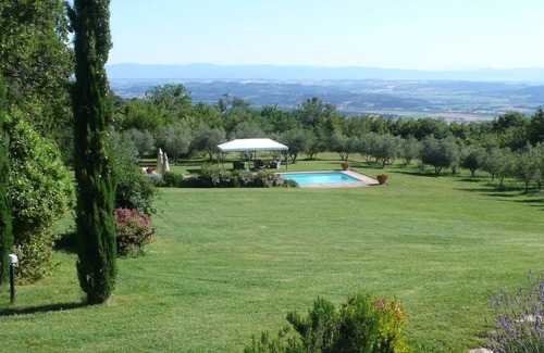 This beautiful charming country house seems to be right out of a fairy tale, and definitely in the dreams of those longing for a Tuscan country home experience. Your journey to 'Il Felceto' takes you through some of the most beautiful landscapes in Tuscany before you arrive to an elegant iron gate. Behind this gate is a long driveway flanked by cypress trees on both sides and in the distance sits this enchanting stone house surrounded by gardens and stone foot paths. It's a home that has everything: privacy and tranquility among 5 acres of spacious lawns that stretch out to panoramic views of the Val d'Chiana and Val d'Orcia, enchanting outdoor areas for dining and relaxing, a well-equipped kitchen that includes a countertop working fireplace that is a must for every Italian home for toasting bread, roasting chestnuts, grilling steaks. The outdoor spaces are picture perfect with privacy and views, a swimming pool set among sprawling lawns and bordered by an olive grove.