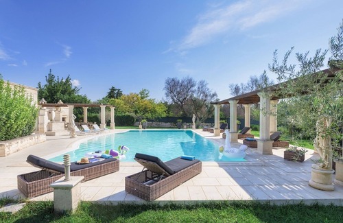 Villa La Dolce Vita, an elegant modern building with a touch of old-time charm, is located in the ancient hill town of Oria, in northern Salento and in a central position with respect to well-known places such as Ostuni, Martina Franca and Lecce. The internal and external areas of the villa are in perfect harmony with the environment, thanks also to the skilful use of materials such as exposed natural stone in contrast with the white of the walls, and tastefully chosen, old-style furnishing accessories. This elegant villa has two floors with the three bedrooms and living areas evenly distributed. The exterior of Villa La Dolce Vita is a perfect mix of harmonies and scents, of Mediterranean scrub and ornamental plants, of rows of vines and olive trees where, just by gazing at it, your mind will relax. A colourful orange grove enclosed in a small courtyard will be the ideal setting for your open-air meals, transmitting unique aromas and flavours. The various spaces have been cleverly arranged, creating areas perfect for relaxing in good company: the cosy dining area shaded by a large gazebo, with wood oven and brick-built barbecue, the large swimming pool embellished by an elegant patio with brick columns in front of the magnificent frame of olive trees, will indeed be the setting for an unforgettable holiday.