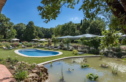 About 4 hectares of flat, fenced terrain surround the house, a good part of which consists of an accessible wood. Surrounding the house, an abundant well-tended vegetation embellishes the outdoor living areas: a gazebo with a dining table, comfortable armchairs outside the bedroom French windows, an amazing veranda near the swimming pool. Large areas of lawn, shady oaks, numerous pots of hydrangeas and more than 1000 roses planted all around valorise the park which is completed by a golf driving range, reachable through a scenic driveway surrounded by wisteria.The property is equipped with an automatic access gate and a large parking area near the entrance to the villa.Please notice that photos are taken in spring, therefore flower blossoming, and the colours of the gardens' grass could be different at the moment of your arrival at the villa.