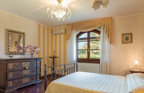 The park of Villa Solidea is completely fenced and extends for about half a hectare between lawn and paving. The garden, bordered along the entire perimeter by hedges, and enriched with plants and flowers, surrounds the villa and contains a fully-equipped portico at the kitchen exit, a play area for children and multiple seating areas. Next to the pool area is a spacious glassed-in veranda containing a well-equipped kitchen and a dining table; adjacent is a brick structure with barbecue and wood oven. Past the pedestrian and vehicle automatic entrance gate is the parking area shaded by a pergola.Please notice that photos are taken in spring, therefore flower blossoming, and the colours of the gardens' grass could be different at the moment of your arrival at the villa.