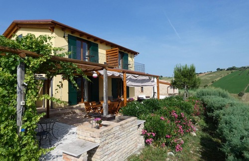 Villa Il Frutteto is situated on the outskirts of the village of Bellante, which is located between the small city of Teramo and the coastal town of Giulianova in Abruzzo. The location is very quiet with 360' views over rolling hills covered with olive groves, wheat fields, and sunflowers with small hilltop villages dotted around and distant views to the Gran Sasso mountain range. The villa is easy to get to being only 8 minutes drive from the A14 autostrada and 4 minutes from A24 superstrada giving easy access to the mountains of the national parks and the beaches at Giulianova, Tortoreto, Roseto degli Abruzzi and Pineto. It is at the end of a 1km stone road so there is no passing traffic just tranquility!