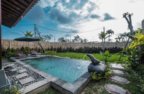 Newly built boutique bungalow located just a few minutes drive from the world famous Tegalalang Rice Terrace, this house is built on spacious plot of land with its own swimming pool overlooking rice fields. It's really an ideal location to chill or exploring Ubud as The Tirta Empul Water Temple, Tegalalang Street, and Gunung Kawi Temple and Agrotourism spots are all within the vicinity. Bedroom is decorated with hand crafted furnitures and soft furnishing to make your stay even more comfortable.